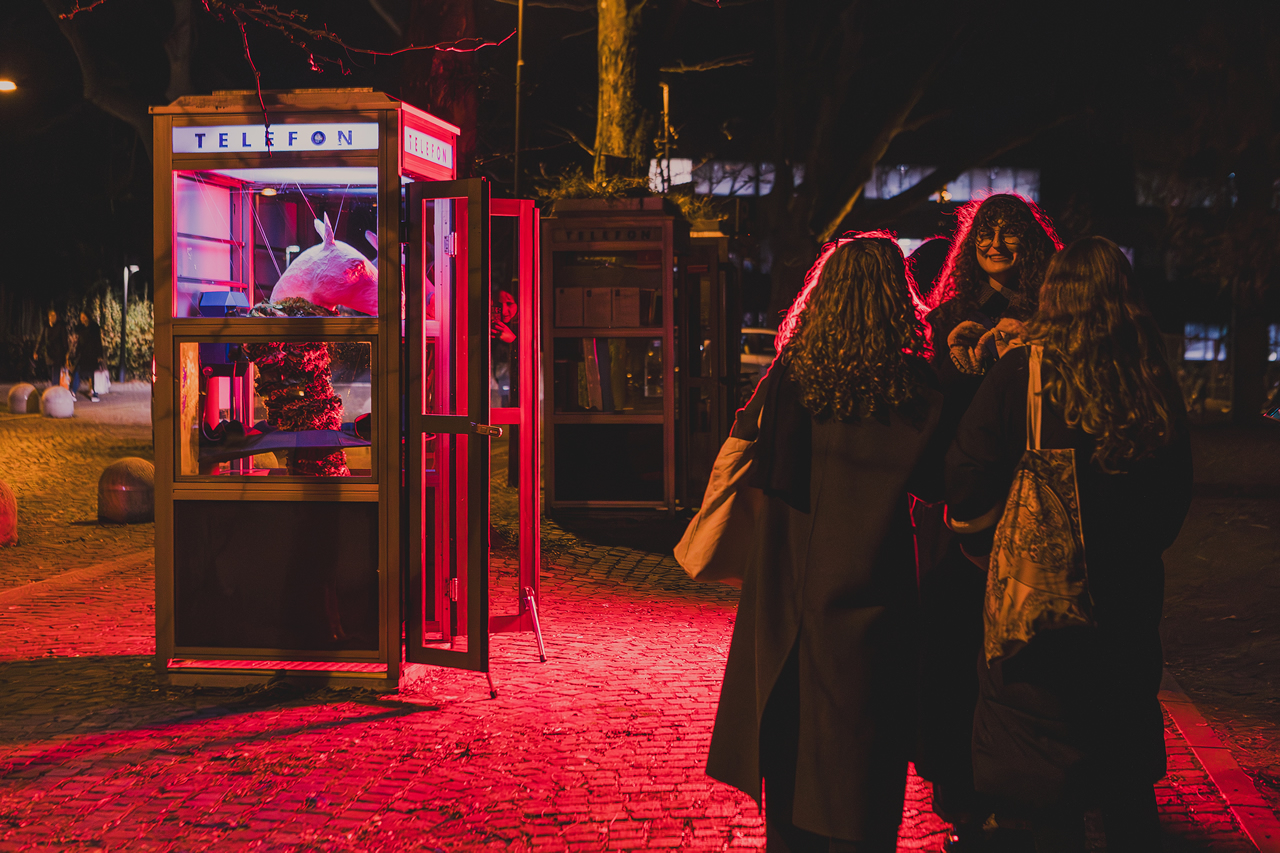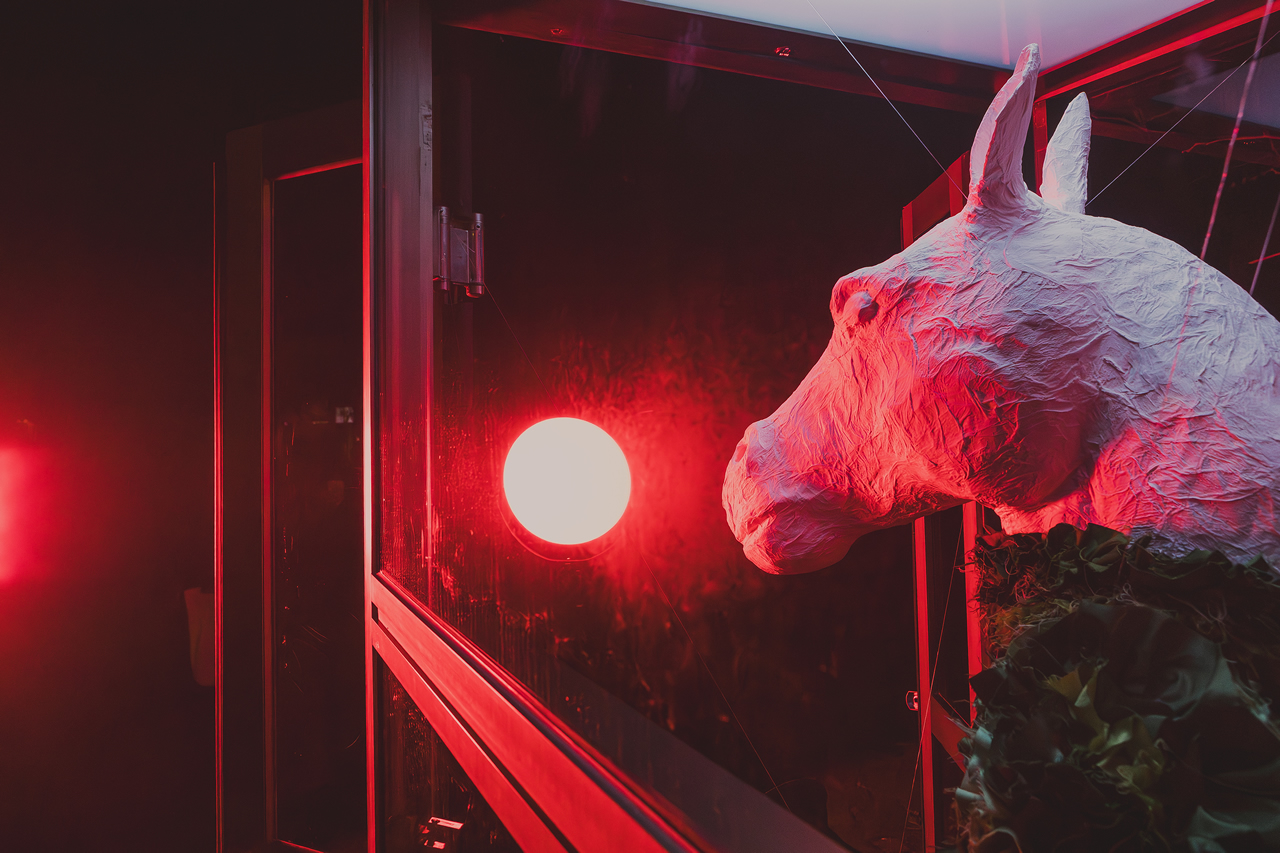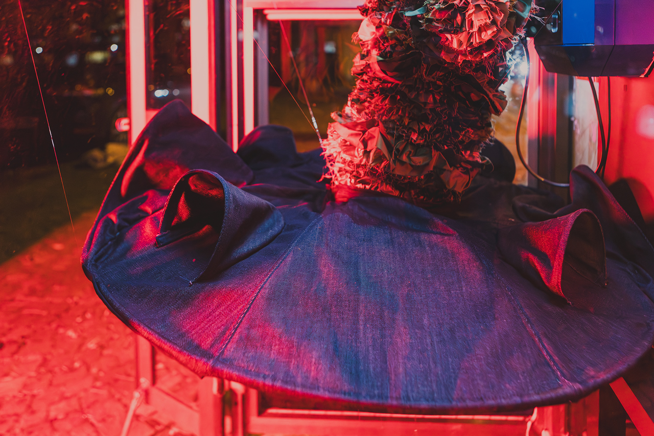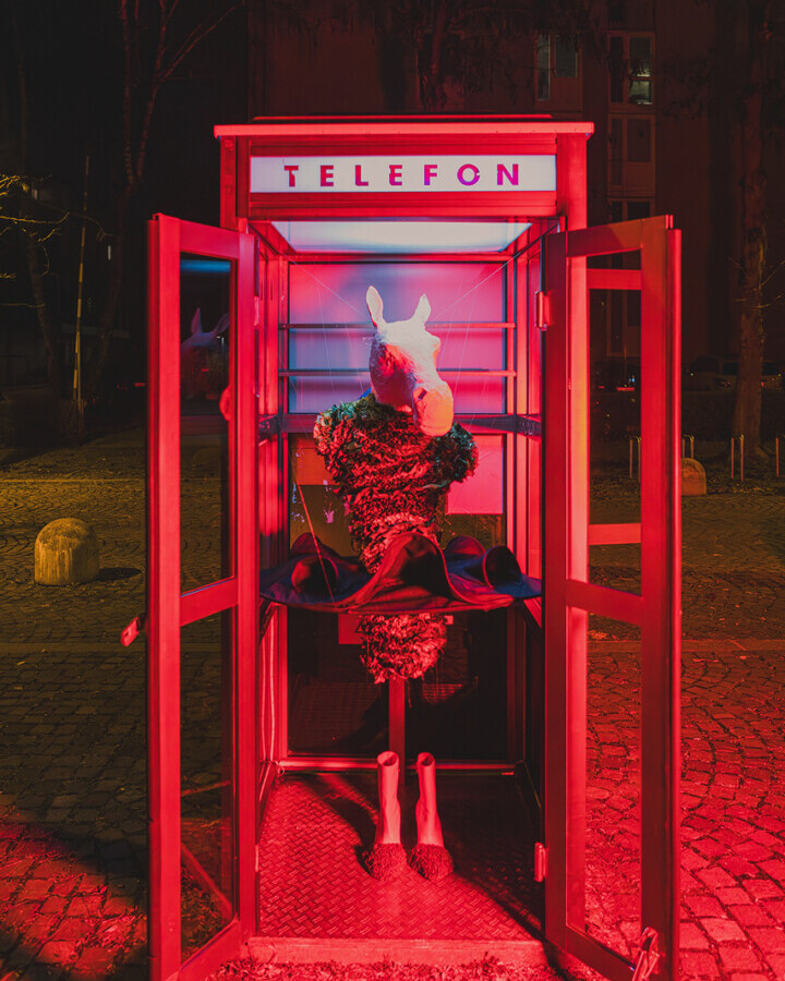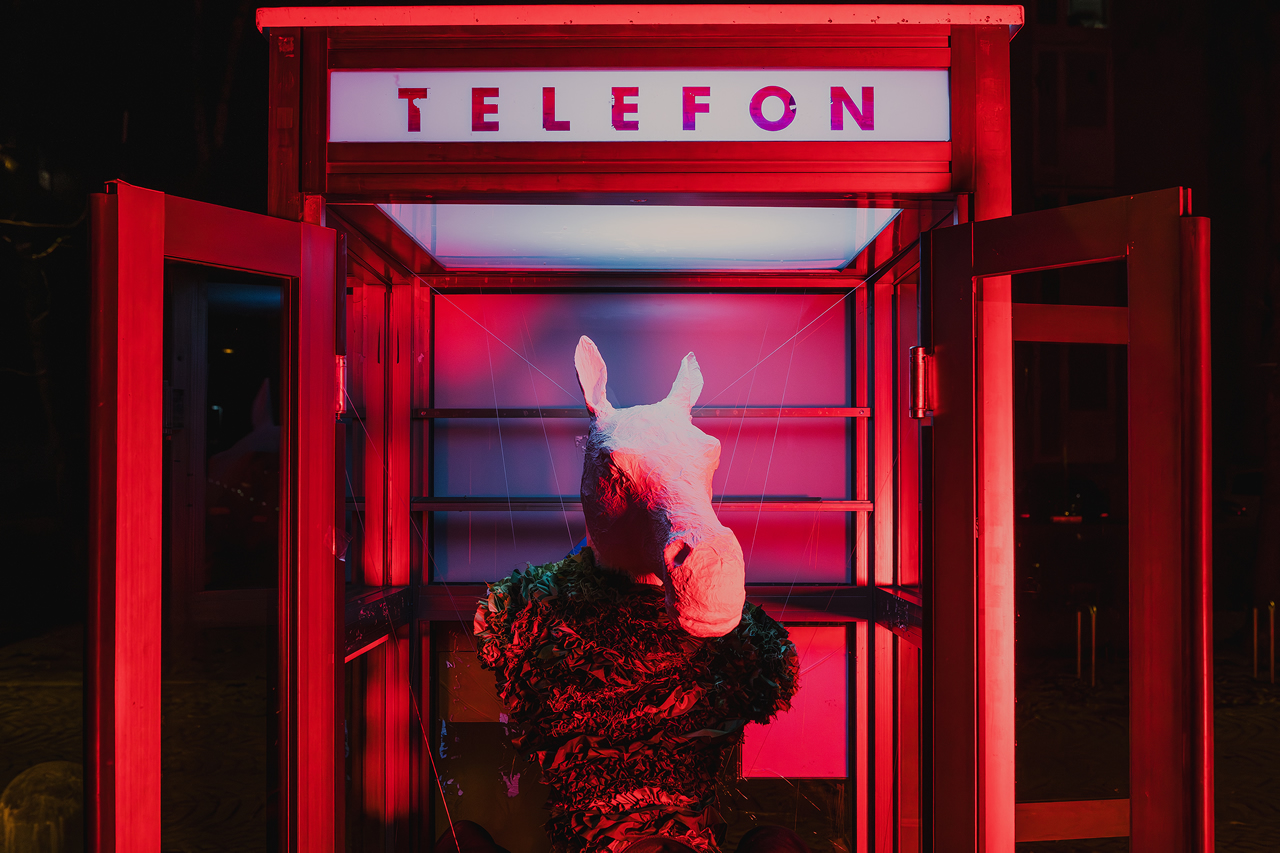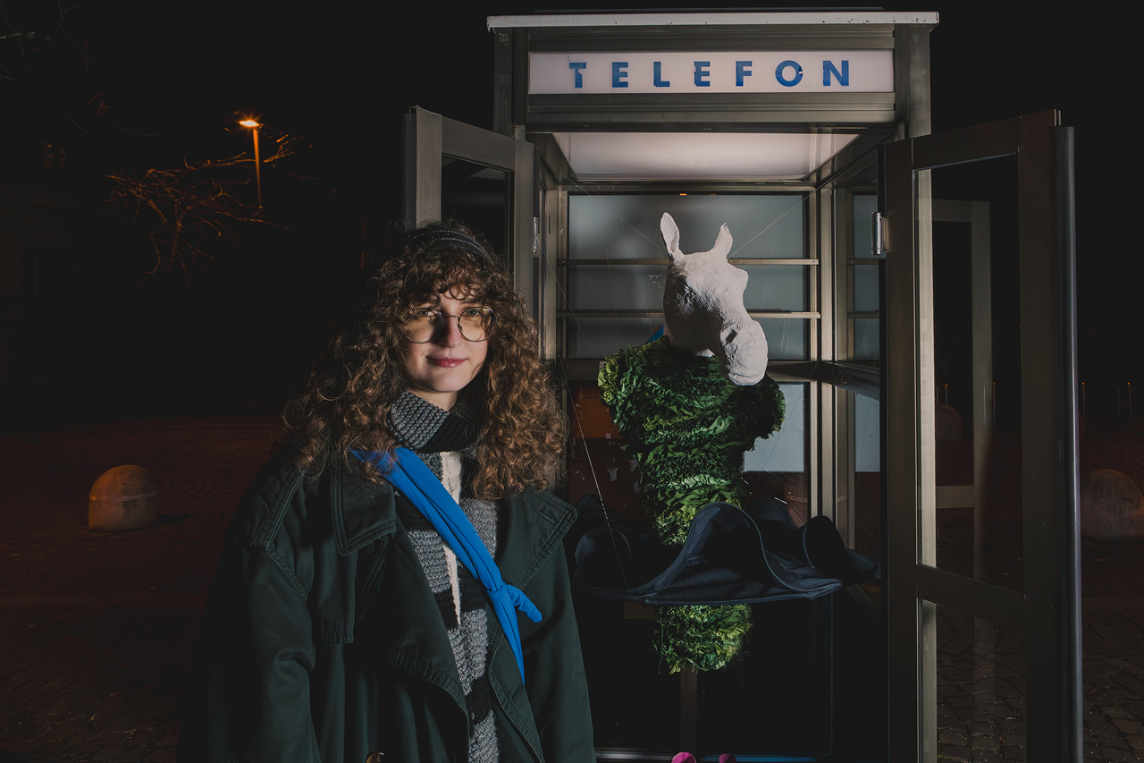 Središče postavitve je obleka, nastala v študijskem procesu na Naravoslovno tehniški fakulteti pod mentorstvom profesorice Almire Sadar. Za prostor Govorilnice jo je Alja nadgradila s konjsko glavo iz papirja maše in s čevlji, ki silhueto raztegnejo v novo pripoved. Kontrast med tekstilom in skulpturalnimi elementi odpira premišljevanje o domu, o izgubi doma, o vojnah, ki ljudem vzamejo osnovni temelj bivanja, ter o hiši kot oblačilu. Obleka postane nosilec vprašanja, v kakšnih prostorih živimo in kaj od njih pričakujemo.