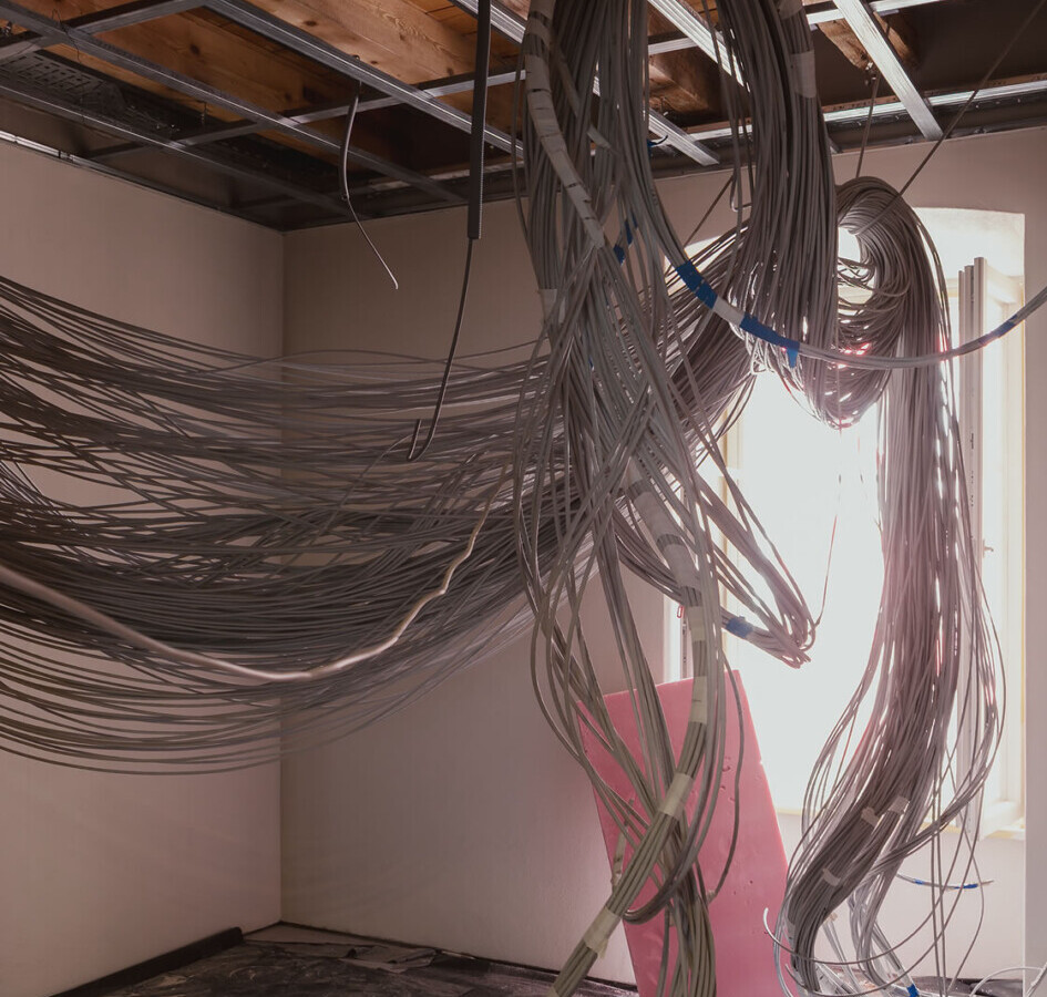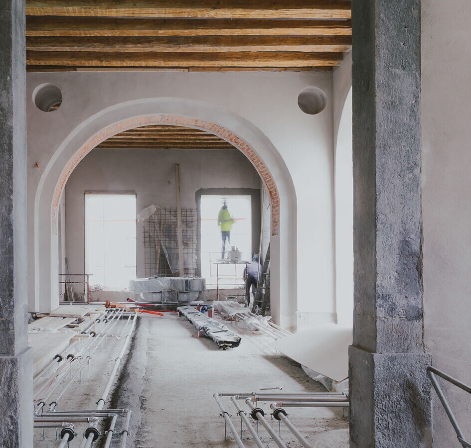 Ne prikazujejo končnega rezultata, temveč proces: ogrodja, napeljave, surove stene, svetlobo in strukturo, iz katerih nastaja sodoben mladinski center.